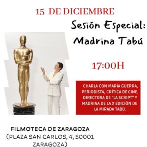 Es un lujo contar este año con la periodista y crítica de cine María Guerra como Madrina Tabú de la X Edición del Festival Internacional de Cortometrajes La Mirada Tabú. Además de contar con su presencia en la Gala de Clausura del próximo sábado 16 de diciembre en Caixaforum Zaragoza (19 h., acceso libre hasta…