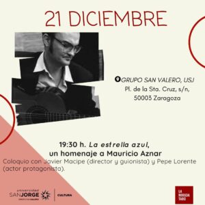 Jueves, 21 de diciembre, a las 19.30 horas en la sede del Grupo San Valero USJ (Pl. de la Sta. Cruz, s/n, 50003 Zaragoza), proyección del tráiler «La estrella azul», donde se cuenta la historia de Mauricio Aznar, el cantante de Más Birras. Después de la proyección, coloquio con Javier Macipe, director y guionista, y…