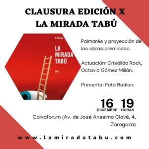 FILMOTECA DE ZARAGOZA (Plaza San Carlos, 4, Zaragoza)12 h. Cine y Tabú.Dos transgresores: Welles y KubrickCharla con Moisés Rodríguez, director y presentador del programa semanal de cine SECUENCIAS EN 24 h., TVE—CAIXAFORUM ZARAGOZA (Av. de José Anselmo Clavé, 4, Zaragoza)19 h. CLAUSURAPalmarés y proyección de las obras premiadas.Presenta: Pato Badian. Actuación: Crisálida, Octavio Gómez Milián…