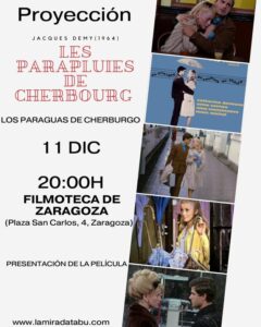 Proyección de la tercera película asociada a la exposición “La mujer en el cine: arquetipos y mitos”. Presentación de ‘Les Parapluies de Cherbourg’ / ‘Los paraguas de Cherburgo’, de Jacques Demy (1964, 88 min., Francia-Alemania) VOSE. Fecha: 11 de enero Hora: 20.00 horas Lugar: Filmoteca de Zaragoza (Plaza San Carlos, 4, 50001 Zaragoza)