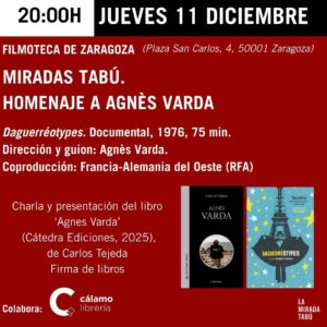 20:00 h. Miradas Tabú. Homenaje Agnès Varda. Filmoteca de Zaragoza (Plaza San Carlos, 4, 50001 Zaragoza) COLABORA: Librería CálamoDaguerréotypes (Documental, 1976, 80 min., Agnès Varda). Coproducción: Francia-Alemania del Oeste (RFA). Presentación del libro ‘Agnes Varda’ (Cátedra Ediciones, 2025, Carlos Tejeda). Firma de libros.