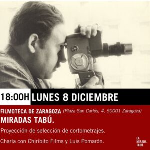 Filmoteca de Zaragoza (Plaza San Carlos, 4, 50001 Zaragoza) 9 de DICIEMBRE: 18:00 h. SESIÓN I Cortometrajes Sección Oficial La Mirada Tabú XII Edición. #Tocarfondo, Carles Bigorra, España 7 días para la Vida Real, Kay Oceans, España ¿IAhora?, María Pérez Moreno, España Arréglame la tele, JON ORMAECHEA, España Cólera, José Luís Lázaro, España ( Con-tactos…