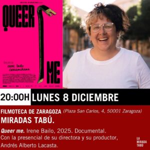 20:00 h. Miradas Tabú. Filmoteca de Zaragoza (Plaza San Carlos, 4, 50001, Zaragoza) Queer me, Irene Bailo, 2025. Documental. Con la presencia de su directora y su productor, Andrés Alberto Lacasta. SINOPSIS: Desde sus primeros amores adolescentes hasta el descubrimiento de la comunidad queer de Toulouse, Irene explora su relación con las normas, las de…