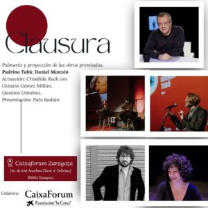 18:30 h. Clausura CaixaForum Zaragoza (Av. de José Anselmo Clavé, 4, 50004 Zaragoza) Palmarés y proyección de las obras premiadas. Actuación: Crisálida Rock, Octavio Gómez Milián, Gustavo Giménez Presentación: Pato Badián