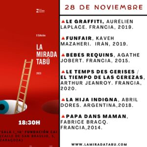 La agenda de actos previos de la X Edición del Festival Internacional de Cortometrajes La Mirada Tabú volverá a contar con dos citas en la ‘Sala i_10’ Fundación CAI del Centro Joaquín Roncal de Zaragoza. MARTES 21 Noviembre Salón de Actos Centro Joaquín Roncal (Calle de San Braulio, 5, 50003, Zaragoza) 18.30 h. Proyección Retrospectiva…