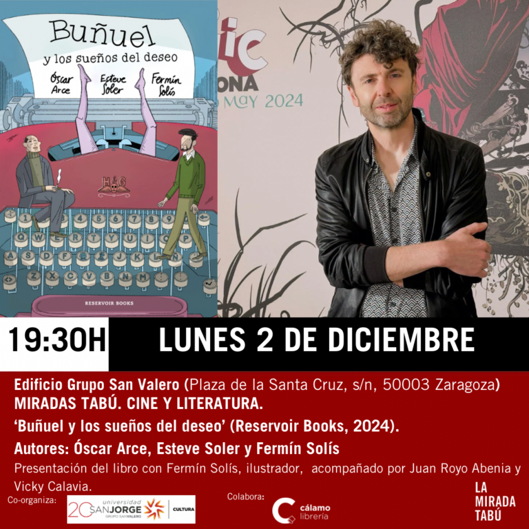 LUNES 2 Diciembre Edificio Grupo San Valero (Plaza de la Santa Cruz, s/n, 50003 Zaragoza) 19.30 h. Miradas Tabú. Cine y Literatura. ‘Buñuel y los sueños del deseo’ (Reservoir Books, 2024). Autores: Óscar Arce, Esteve Soler y Fermín Solís Presentación del libro con Fermín Solís, ilustrador, acompañado por Juan Royo Abenia (economista y especialista en cómic) y Vicky Calavia, directora de La…