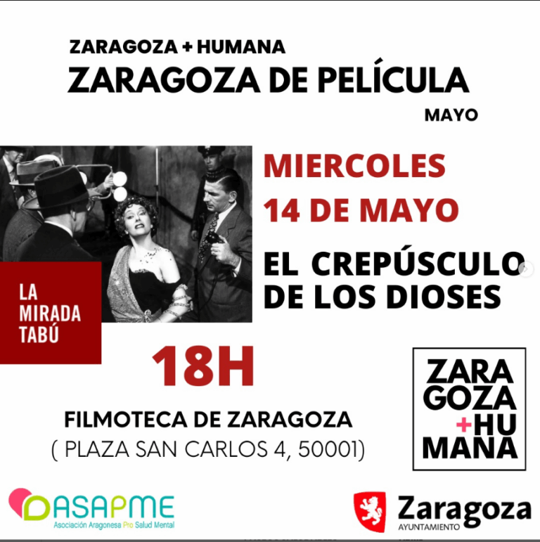 Proyecto Zaragoza+Humana, organizado por Asapme en colaboración con el Festival Internacional de Cortometrajes La Mirada Tabú y el Ayuntamiento de Zaragoza. Miércoles, 14 de mayo. SESIÓN I Filmoteca de Zaragoza (Plaza San Carlos, 4, 50001 Zaragoza) 18 h. El crepúsculo de los dioses (Billy Wilder, 1950,110 min.) Coloquio con Ana López Trenco, gerente de ASAPME Aragón, y Cristina Yáñez,…