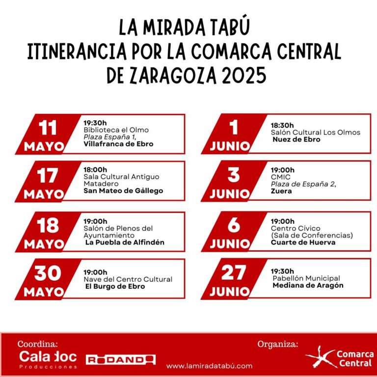 Leer másCinco cortos finalistas de La Mirada Tabú 2024 han sido seleccionados para la muestra especial en itinerancia que recorrerá la Comarca Central de Zaragoza. La entrada es gratuita y el público con sus votos decidirá cuál se lleva el Premio del Público de la Comarca¡La gran final será el 28 de septiembre en Cadrete! Próximas…